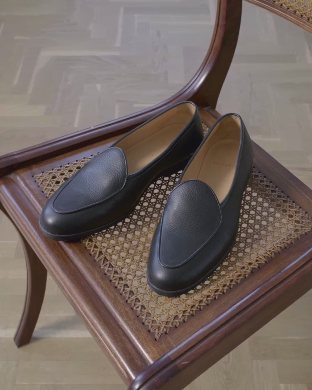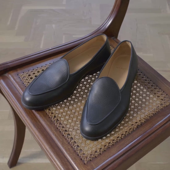 Visual simplicity is elevated by the interplay of texture and form. The black grain leather upper catches light with understated depth, while the low profile and seamless apron nod to the Belgian loafer tradition. Inside, the lining and secure heel hold create a sense of ease, inviting all-day wear without sacrificing elegance.