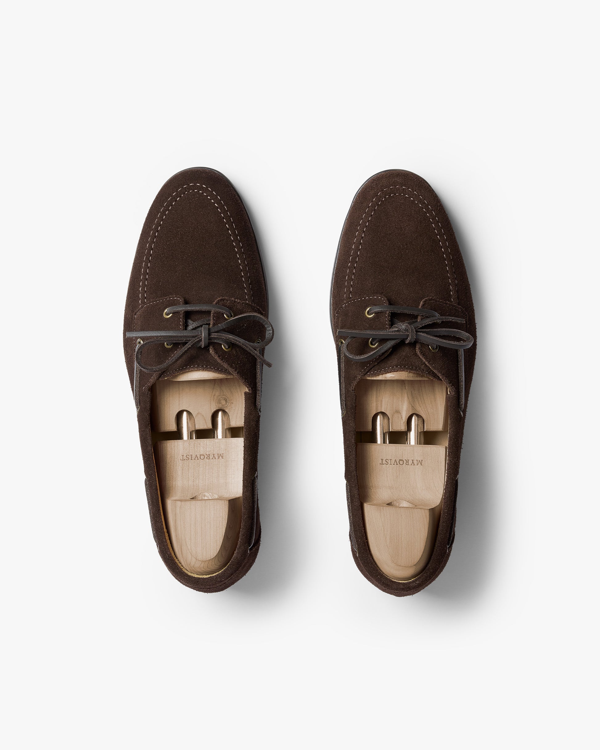 Sandhamn en daim marron foncé incarne une élégance décontractée avec un profil classique de chaussure bateau. Le plateau mocassin cousu et le laçage 360° dessinent une silhouette épurée, tandis que le daim souple gagne un caractère discret au fil du temps. Chaque paire est fabriquée à la main au Portugal, pour un équilibre mesuré entre aisance et intention.